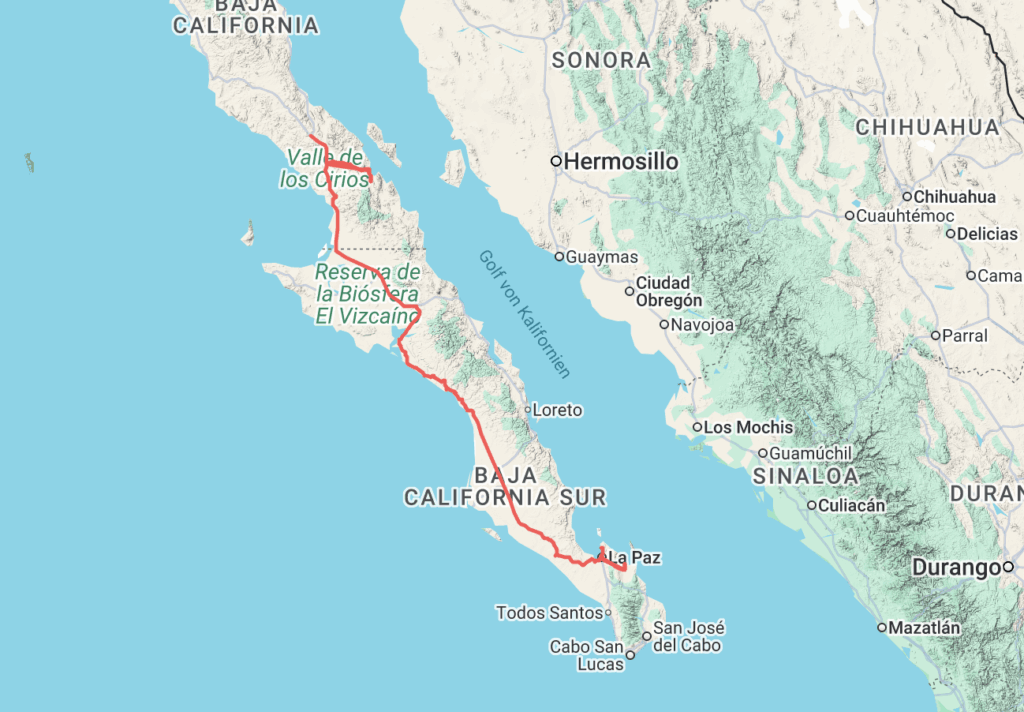 Am ersten Januar fuhren wir endlich weiter. Wir schrieben mit dem Schweizer Paar, welches wir in San Felipe kennengelernt hatten und planten, uns in La Ventana fürs Kitesurfen zu treffen. An einem Tag fuhren wir auf einer Straße, die für mehr als 160 Kilometer einfach schnurgerade war! Das war tatsächlich irgendwie lustiger, als es klingt. Wahrscheinlich hauptsächlich, weil wir den ganzen Tag Rückenwind hatten… Wir flogen nur so dahin und hatten sogar genug Zeit, kurz an einem Supermarkt anzuhalten. Der Verkehr nahm immer mehr zu, je näher wir nach La Paz kamen. Wir zelteten eine Nacht bei einem coolen, kleinen Campingplatz mitten in der Stadt. Mit Platz für nicht mehr als fünf Autos, etwa zwei Zelte und einem hostelähnlichen Gemeinschaftsraum war es wirklich gemütlich.