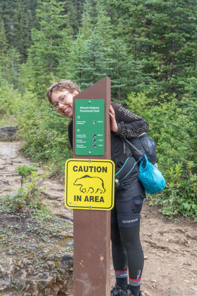 After stashing everything in the lockers, we cycled towards the trailhead. The first seven km of the hike up to Kinney Lake Campground were open to bikes and apparently “nice to cycle”. We were not the only ones fooled by that information! It included stretches of hike a bike and we were not noticeably faster than the hikers… We stored the bikes somewhere in the bushes near the Kinney Lake campground and started our hike towards the Berg Lake Campground.