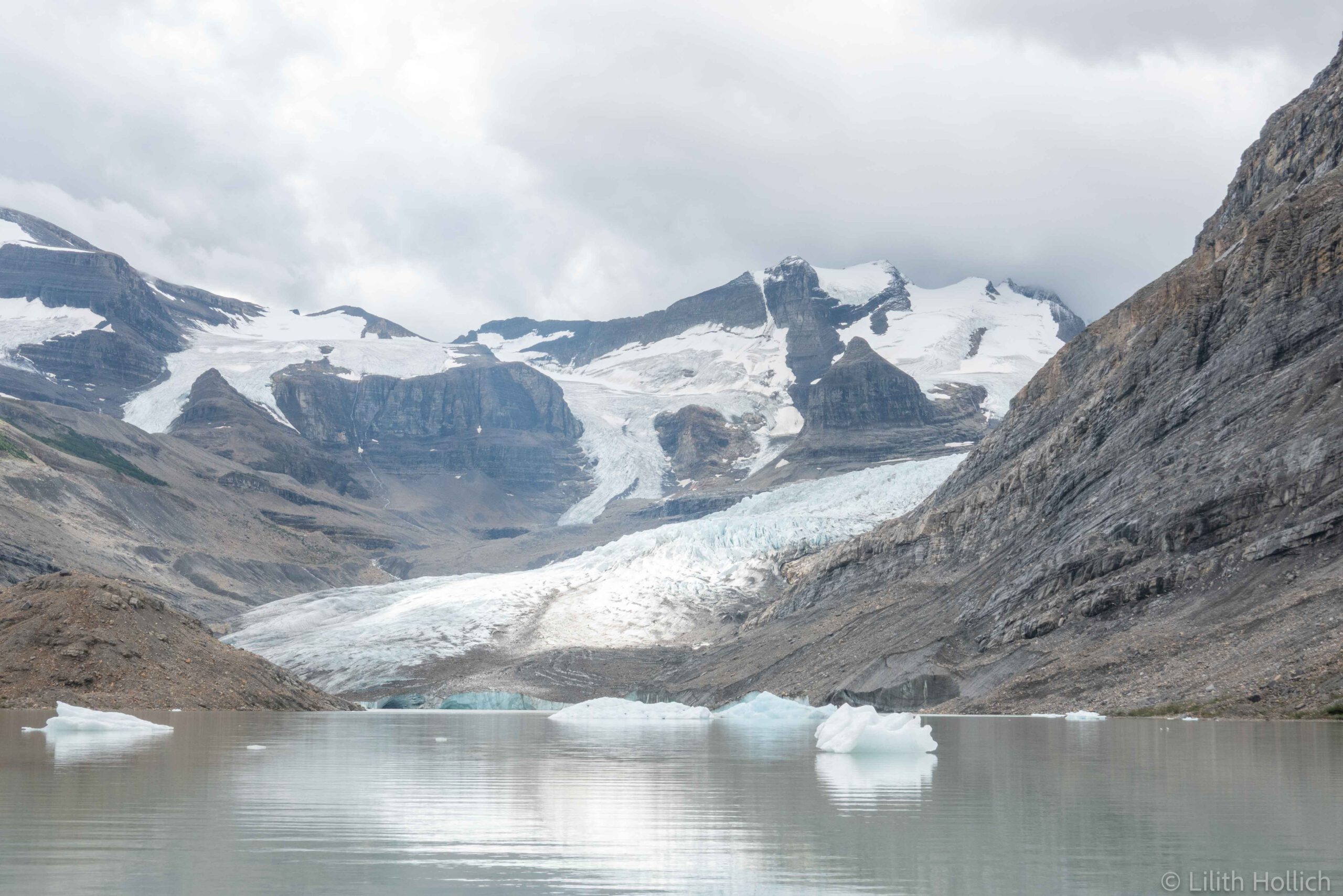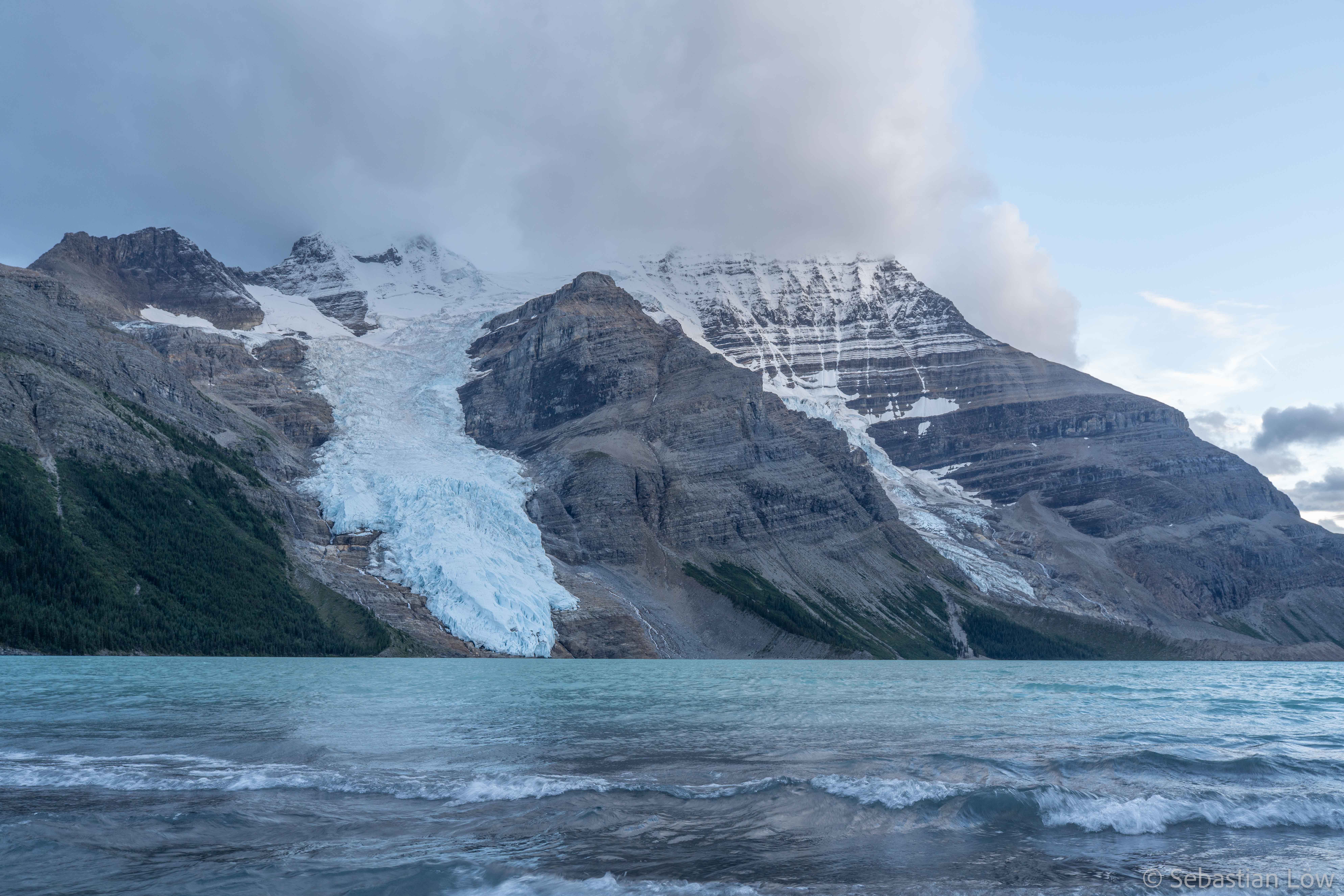 It was raining lightly every now and then, but it wasn’t too bad. The trail was beautiful, with impressive waterfalls on the way. We got to the campsite early in the evening and scored a tent pad close to the shelter, bear lockers and trail. Only the toilet was a bit hidden in the woods! The campground was on the shore of the Berg Lake, opposite of the Berg Lake glacier. What a view! We pitched our tent and spent the evening in the cozy shelter, cooking and eating dinner and writing in our journal.