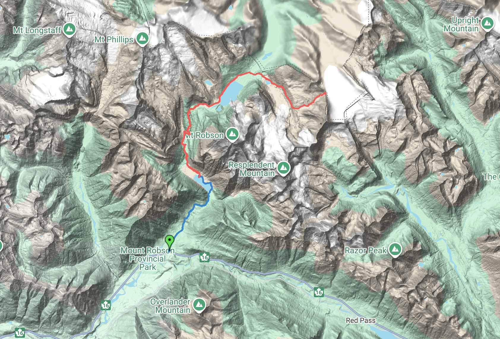 A map of our adventure on the Berg Lake Trail. Blue = cycling, red = hiking.