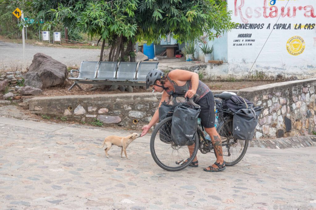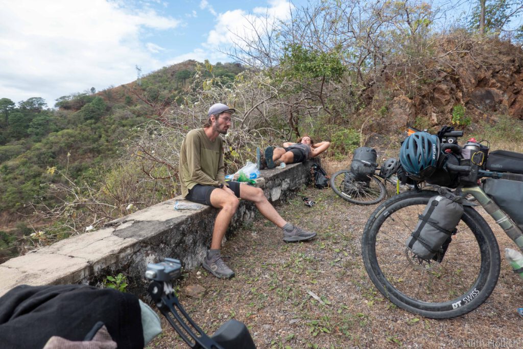 On the new highway, we had a wide shoulder and were overtaken by everyone at a safe distance. Even the national guard passed us at one point and stopped shortly afterwards to talk to us. They advised us against cycling on the old highway; we should continue on to such-and-such bridge, where we could spend the night. However, they didn’t seem to realise that this might be way too far for three cyclists late in the afternoon. So we followed our initial plan, switched to the old highway shortly afterwards and didn’t regret it one bit. In Copala, we stayed with an elderly local, in whose garden we were allowed to camp under banana trees and who told us a lot about the current situation. We learned that the military had been in the area just a few days earlier and that the cartels had therefore retreated further into the jungle – we couldn’t have been there at a better time.