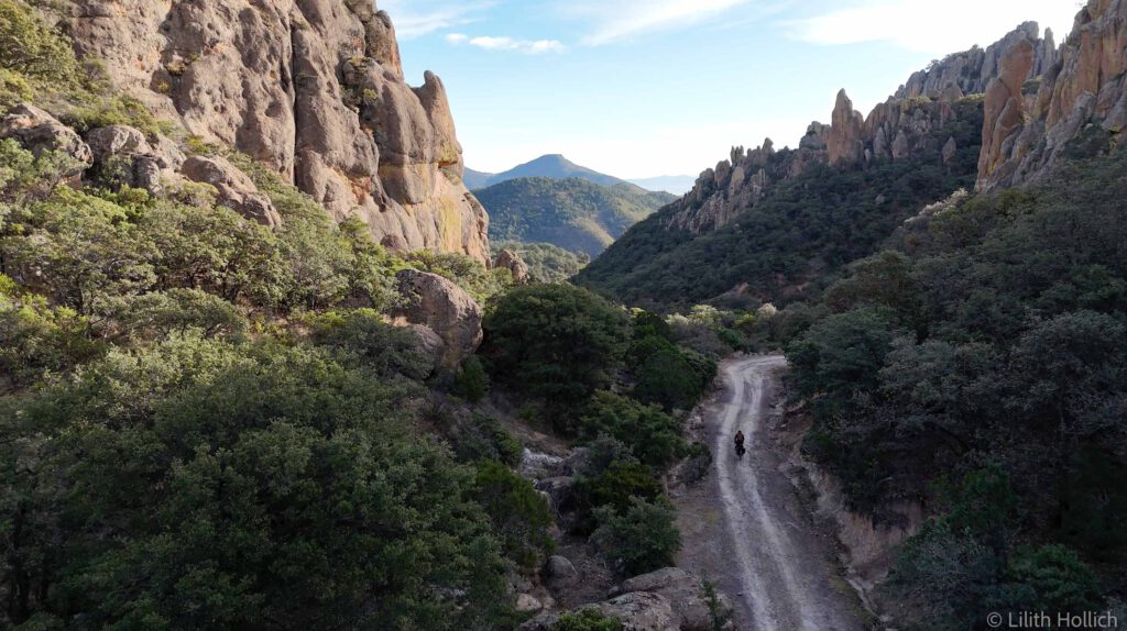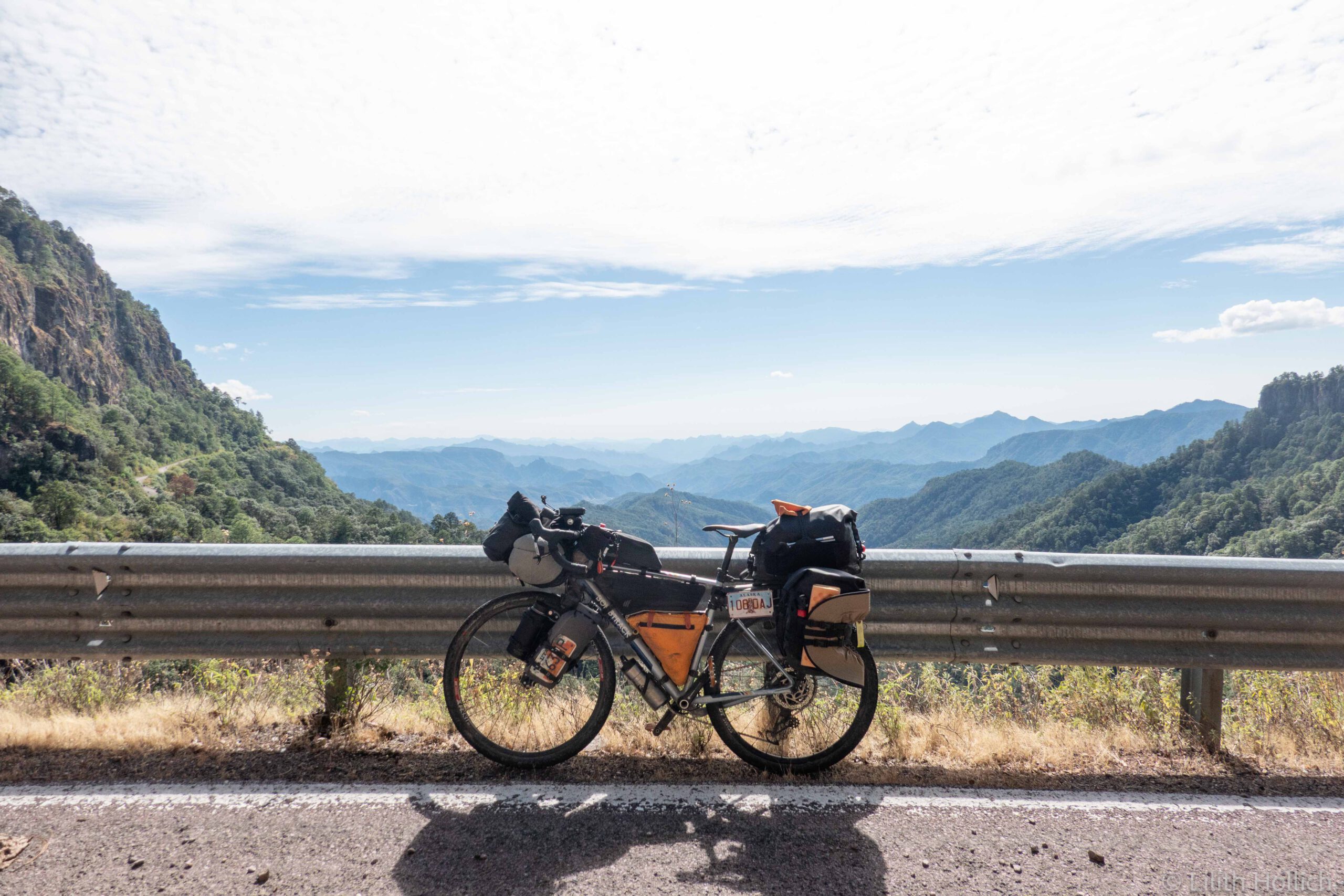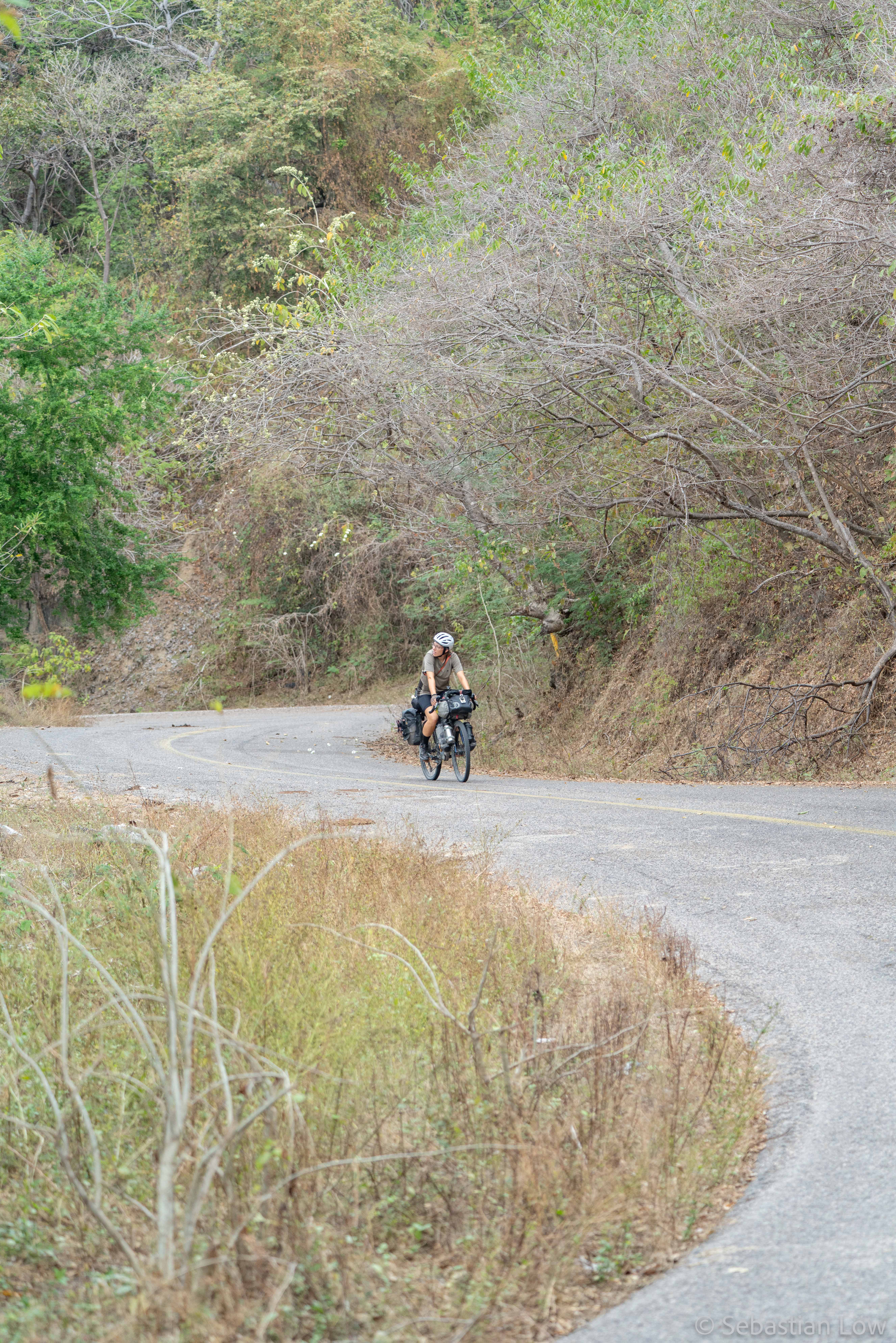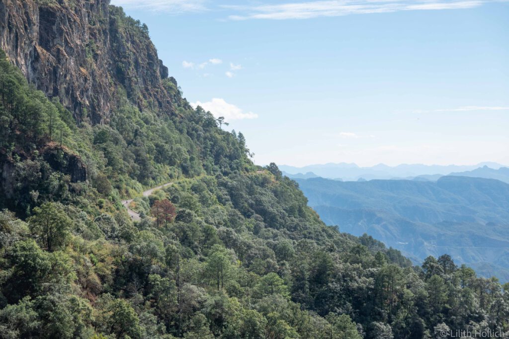 The next few days were beautiful, but at the same time incredibly exhausting. Upon leaving Copala the next morning, we spotted some macaws in the trees and everything felt very tropical; with trees, we had never seen before, birds, we had never heard before and a draining combination of heat and humidity. In two days, we covered 100 kilometres – with a total of 3500 metres of elevation gain! We passed many abandoned villages and restaurants. The reasons for this were likely both the new superhighway and the high level of cartel activity. In El Palmito, we saw a cartel vehicle for the first (and only) time, though its passengers didn’t show any interest in us whatsoever. The road was truly gorgeous. We could tell it hasn’t been used as a main road for some years, as some of the potholes could have swallowed my entire bike and thanks to overgrowing trees and fallen rocks, it wasn’t as wide anymore as it used to be. We saw very few people and vehicles. The higher up in the mountains we went, the more impressive the views became – lush green in every direction and one mountain after another, as far as the eye could see! At some point, the landscape changed from tropical to pine forest.