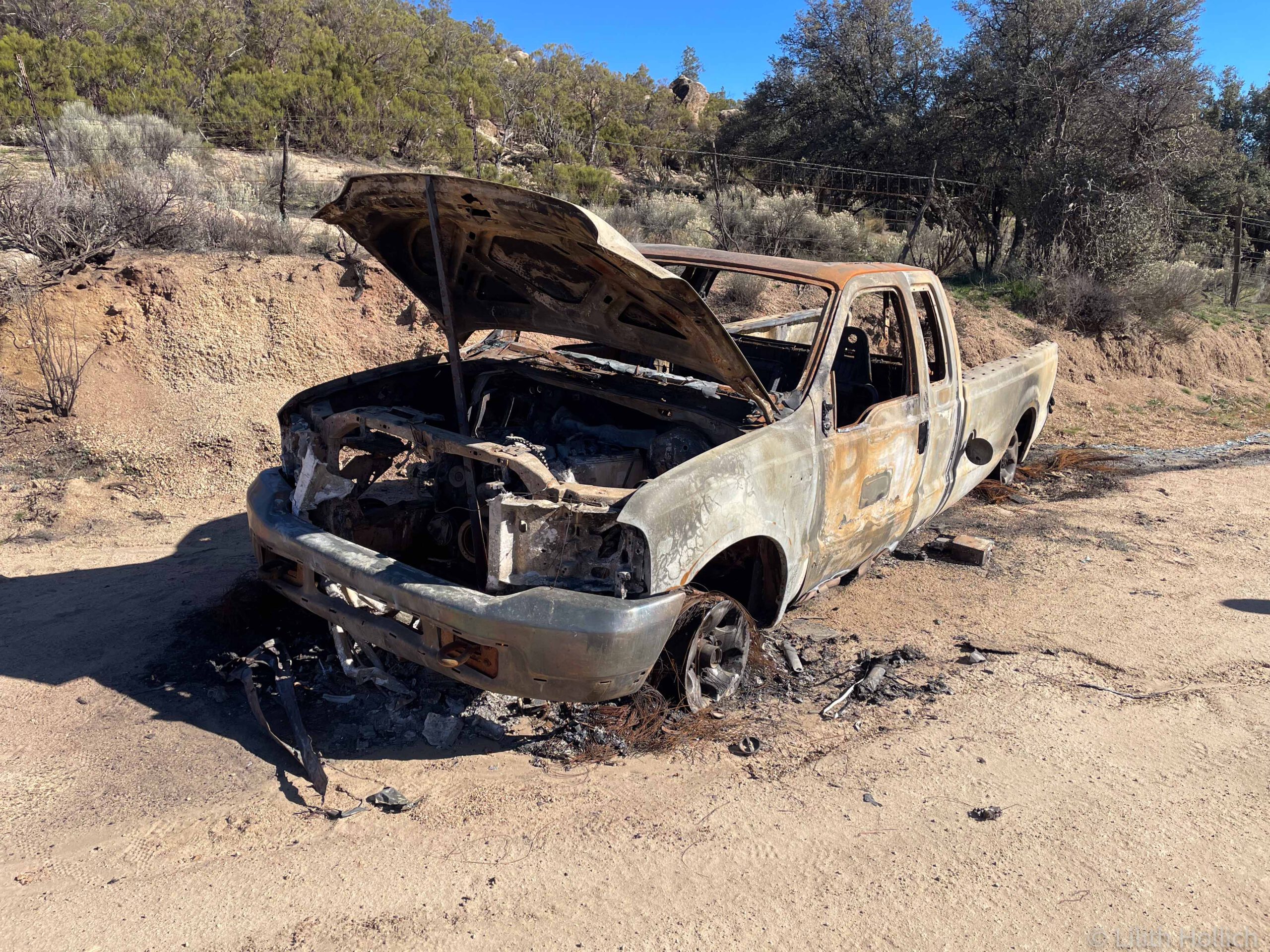 Saying goodbye to Kevin and Lucky was harder than thought and it was nearly lunch time, when we finally rolled out of the building. During our time in the US we had collected (very few) reward points at Domino’s Pizza and made sure to redeem them for free food that afternoon. That night was our last one in the US and we wild camped on public lands. That area seemed to regularly be used as a shooting range, with lots of trash and empty shells. The next morning, we seized the opportunity to finally try out our spare bear spray, which we had found in the US a while ago. There was no way we’d continue carrying the extra spray anymore, and without a label we couldn’t sell or give it away with a clear conscience anyways.