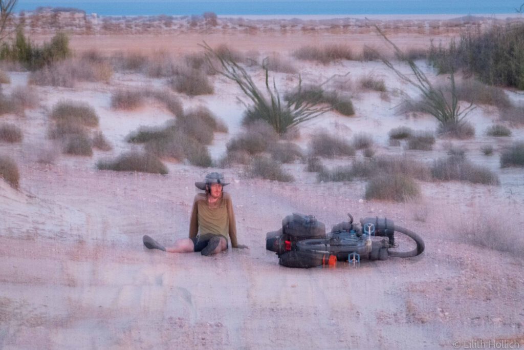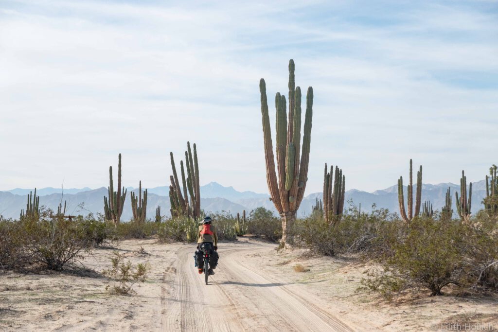 We followed the east coast of the Baja Peninsula south. Every now and then we could see the Gulf of California (also known as the Sea of Cortez) and had the opportunity to camp at the beach. We were even spoiled with a beautiful sunset! The sandy roads weren’t always the best ones to cycle on though…