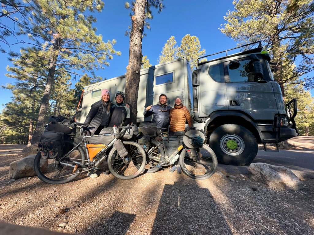 While saying good-bye to Manu and Thiago the next morning, they got approached by a couple from the US. They live part of the year in Alaska and the other part of the year in Utah. When they learned how we travel, they invited us to their place and we announced ourselves for a few days later. Funnily enough it was right next to the route we had planned! Over the following two days, we cycled towards Zion national park. Right before the descent into the park is a tunnel, where cyclists are strictly forbidden. As there isn’t an official shuttle service, we had to find somebody willing to give us a ride through. Fortunately, we didn’t have to wait long until a friendly couple told us to hop on the back of their pickup truck. Yes, the bikes and us went on the bed of the truck! As you know, that wasn’t the first time somebody transported us like that, but it doesn’t necessarily feel safer the more often you need to do it… They dropped us off right after the tunnel and we enjoyed a beautiful downhill into Zion. We were reunited with Kris, one of the cyclists that we had met in Yellowstone. He was staying at the same campground for a few days with a friend of his and generously offered to share his spot. As the campground was fully booked and we were only able to get a spot for one of the two nights, we gratefully accepted his offer.