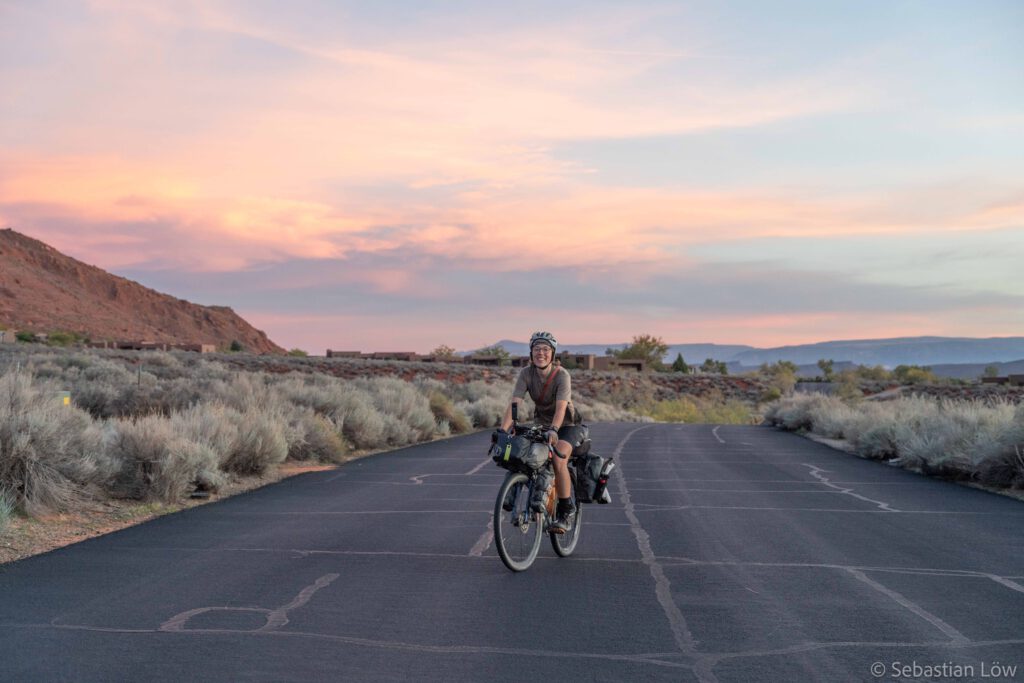From Zion National Park it was only one day of cycling to the couple that invited us to their place when we met in Bryce. It was a hot day and our lunch break took a lot longer than usual. When cycling through St. George, we were impressed with the amount of bike lanes – nearly every road had one! Everywhere were cacti and palm trees. We arrived at their place just after sunset and were so amazed by the landscape. Lots of flat, low-profile houses nestled into the desert, with cacti and Joshua trees all around. They welcomed us with open arms and we were once again incredibly grateful for the hospitality. We ended up taking two days off-bike. Sebi did a lot of maintenance and seized the opportunity to be able to use a sewing machine. I worked on the blog and got a ride to the supermarket. Nice to do the shopping with a car for a change! One evening we even got to use the hot tub, with views of the night sky and Joshua trees.