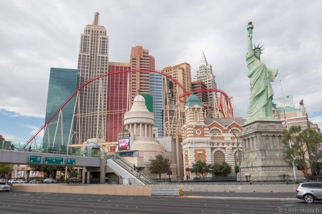 We arrived at the motel and parked our bikes in the rooms. We could see the sphere from our window! All craziness aside, it is quite the impressive building. We decided to go out for dinner and took the monorail into the center of craziness. We stepped right into Paris, Eiffel Tower and Arc de Triomphe in front of us. Little fun fact: That was the second fake Eiffel Tower I saw and I have never seen the real one! We watched a few fountain shows in front of the Bellagio Casino and slowly made our way back to our motel. We learned pretty fast that the casinos were so accessible that you’d inevitably needed to walk through one to get to where you wanna go. Two weeks later, the Formula 1 Grand Prix would take place and everything seemed to be slightly more chaotic than usual, with sidewalks closed and concrete barriers already in place.