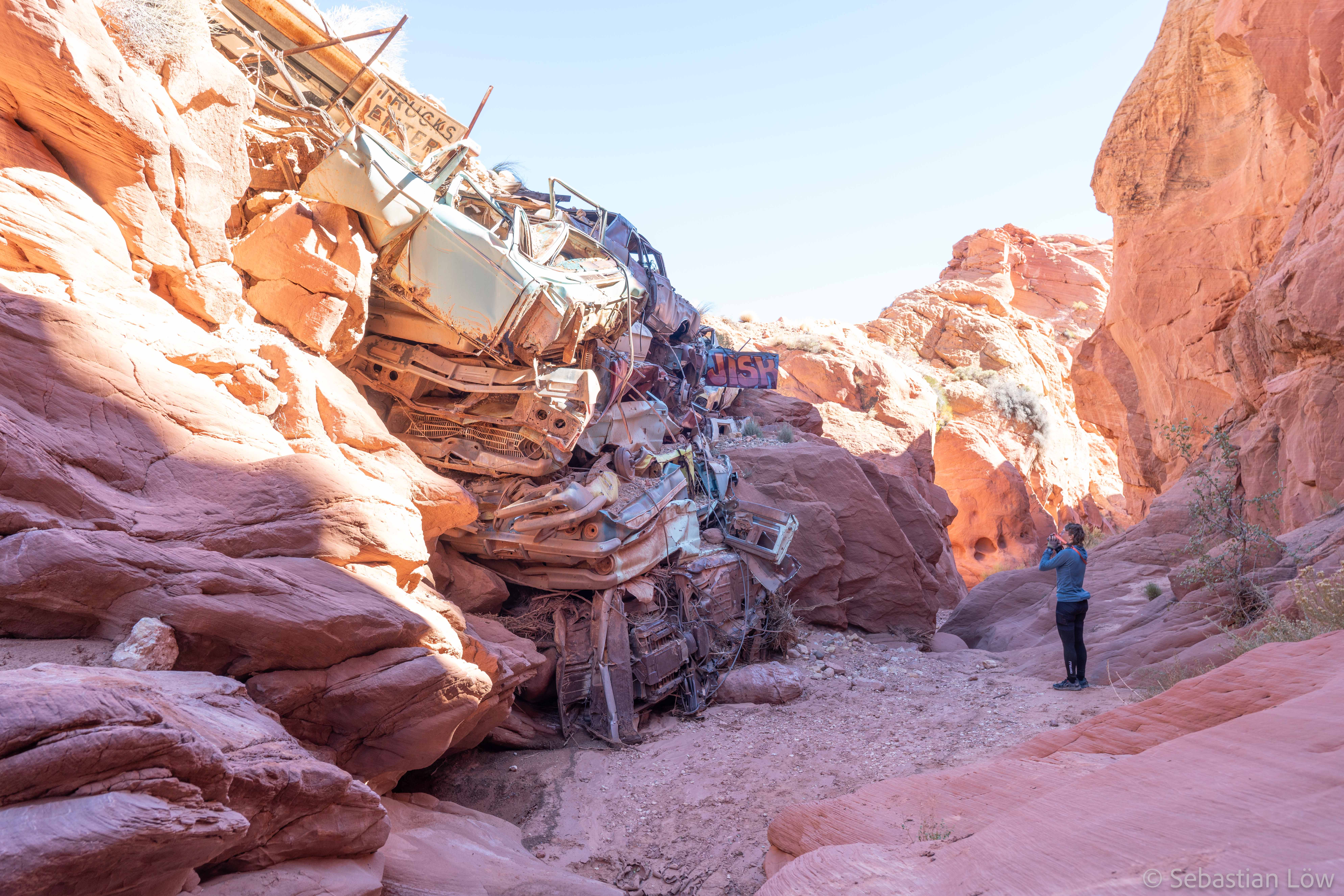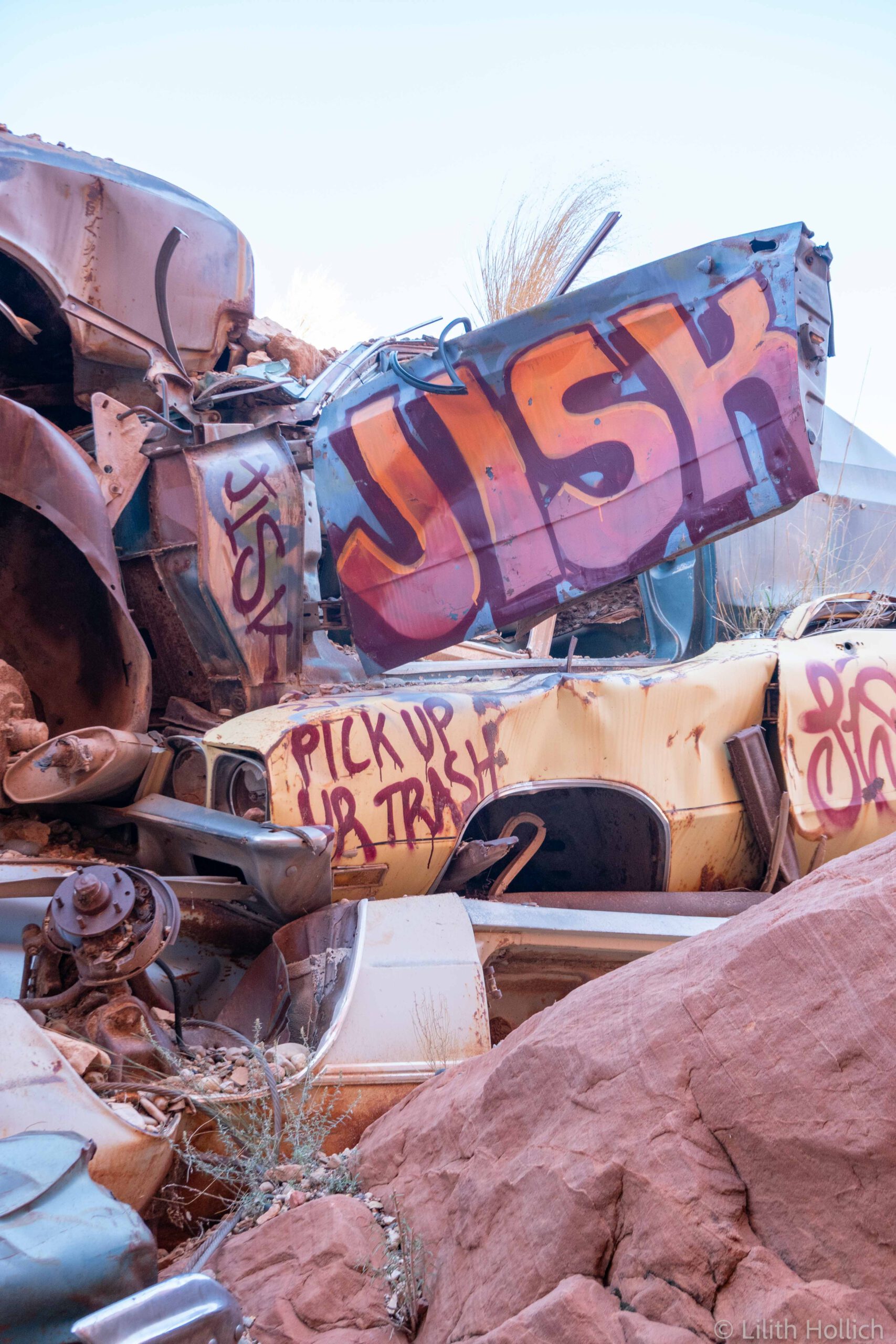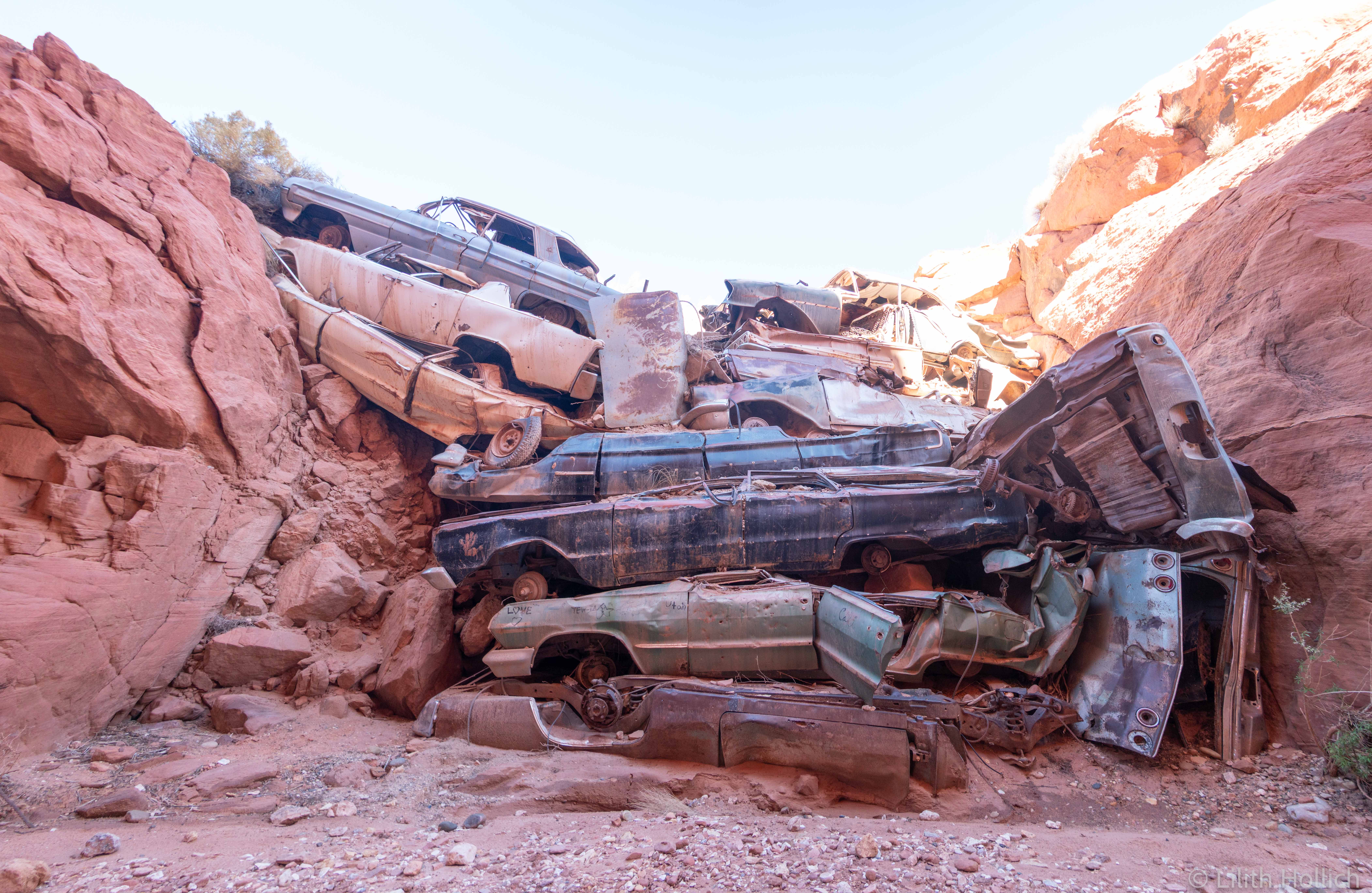On our way back to the main road the next day, we stopped at a fun roadside “attraction” I had spotted on a map the day before. Barely visible from the street, but accessible by a short walk, were stacks of once beautiful, old cars. I later found out that those stacks were deliberately engineered, serving as a cheap alternative to other materials for erosion control.