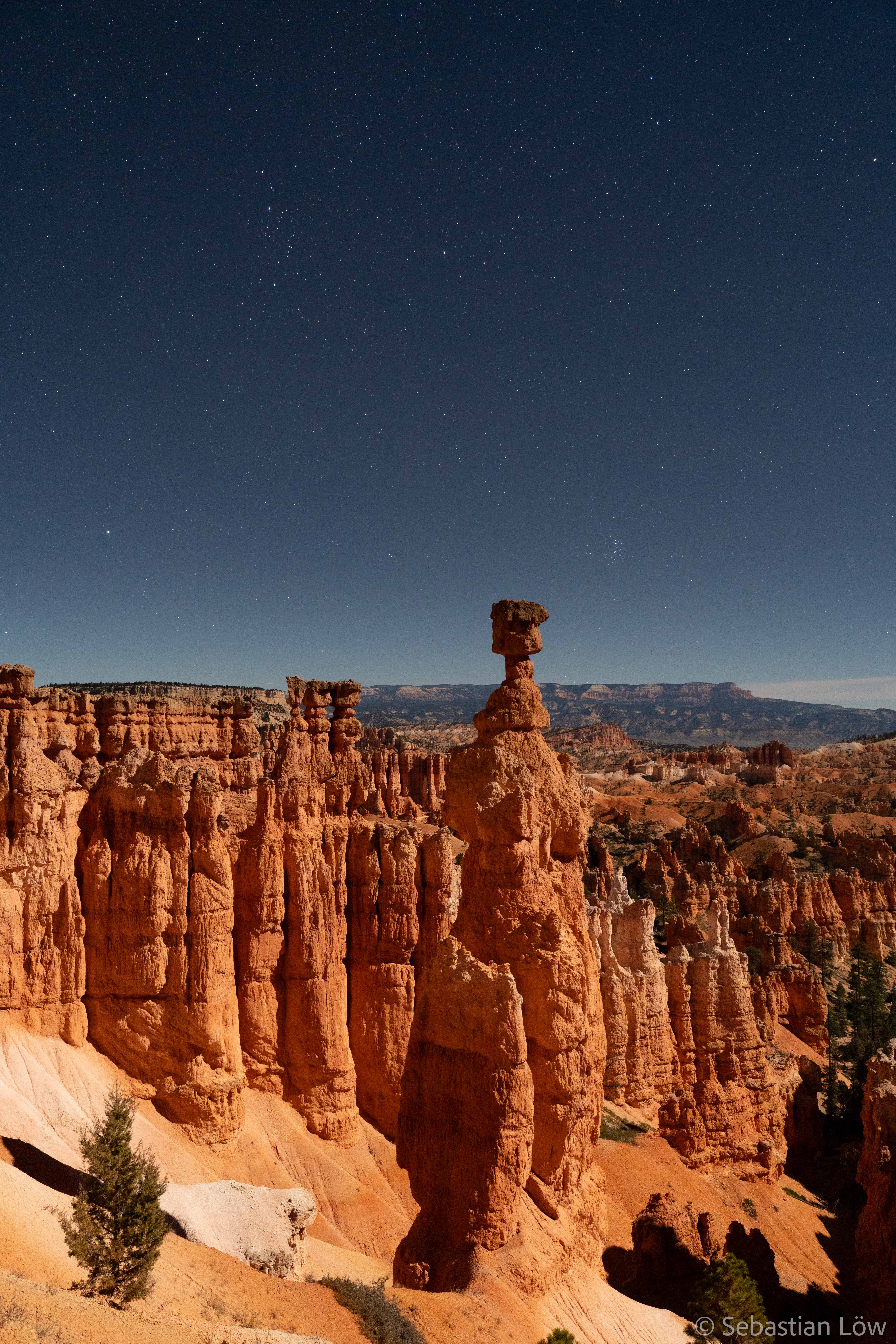 When we rolled back onto pavement the following day, a Swiss truck went past right in front of us and we recognized Manu and Thiago that we had just met the other week! I sent them a message and we arranged to stay on the same campsite at Bryce Canyon National Park the day after. Sebi and I continued all the way to Bryce Canon. It was quite hot and at some point I said that I would really need a cold drink that night, anything else than water. A few minutes later, I found three unopened bottles of coke on the side of the road – they must have fallen off a car! Needless to say, I happily stashed them in my saddle bag. We got to the campsite, pitched our tent and cycled to the sunset viewpoint for dinner. The view from there was spectacular. We stayed until it got dark and Sebi took some pictures with hoodoos under the night sky.