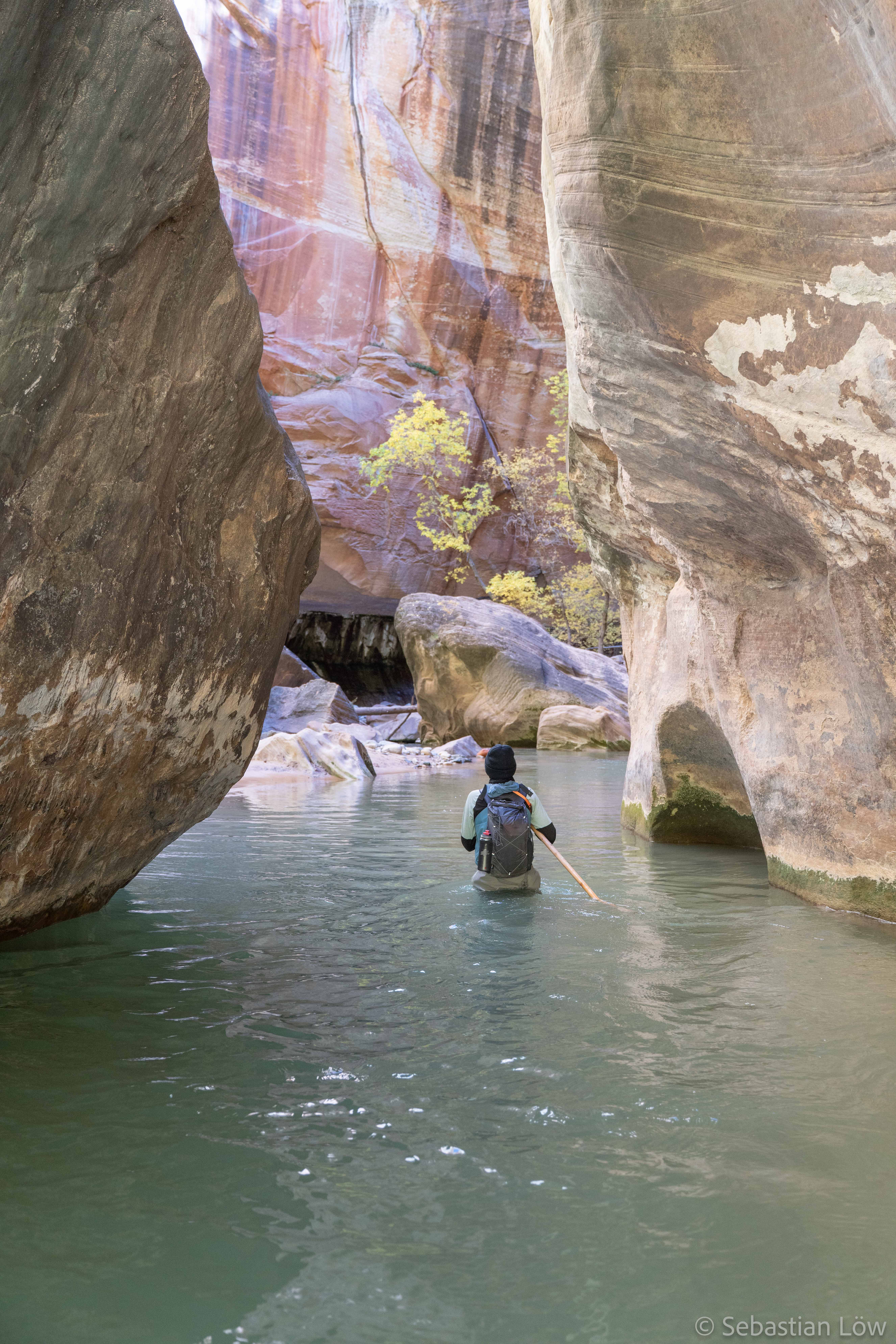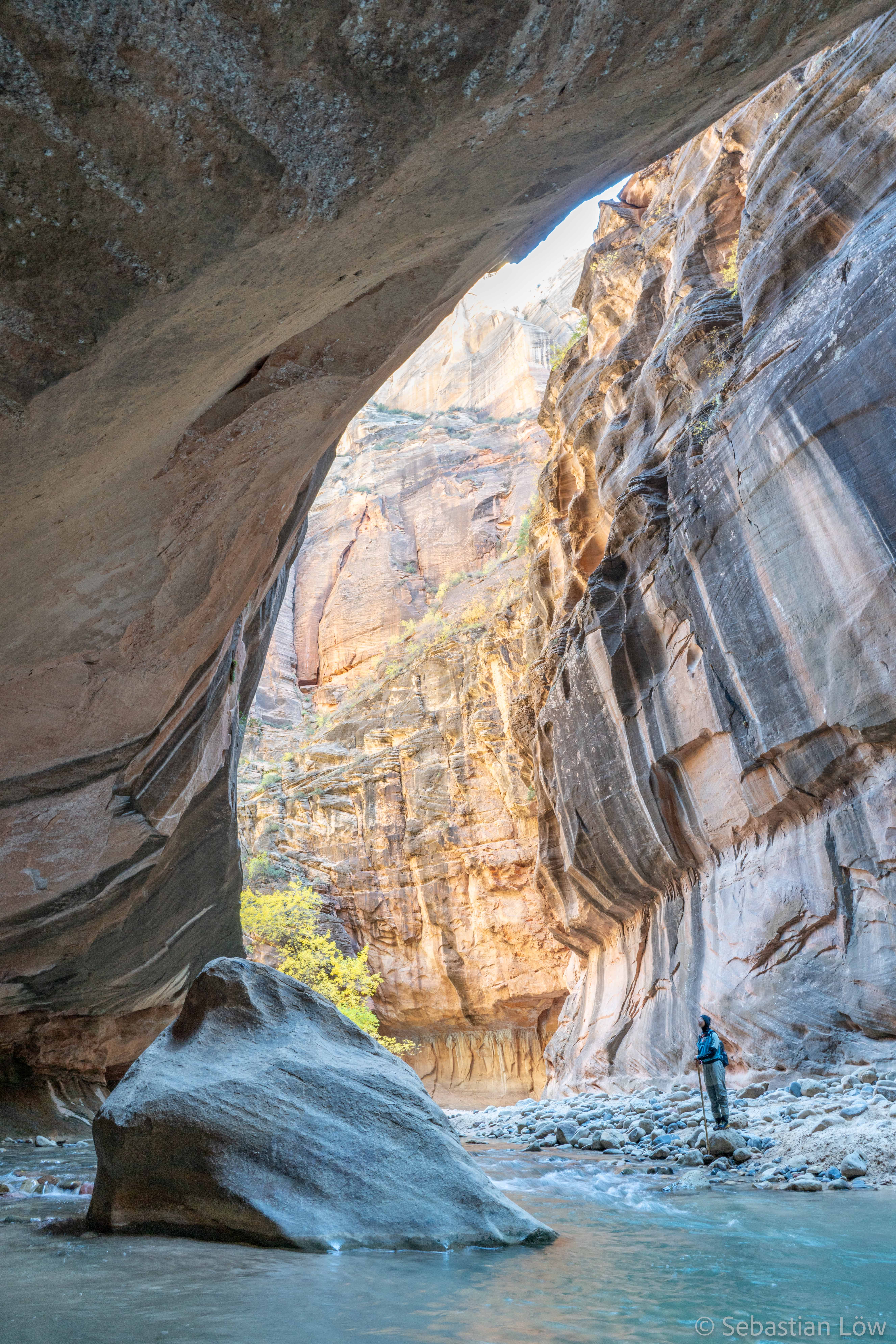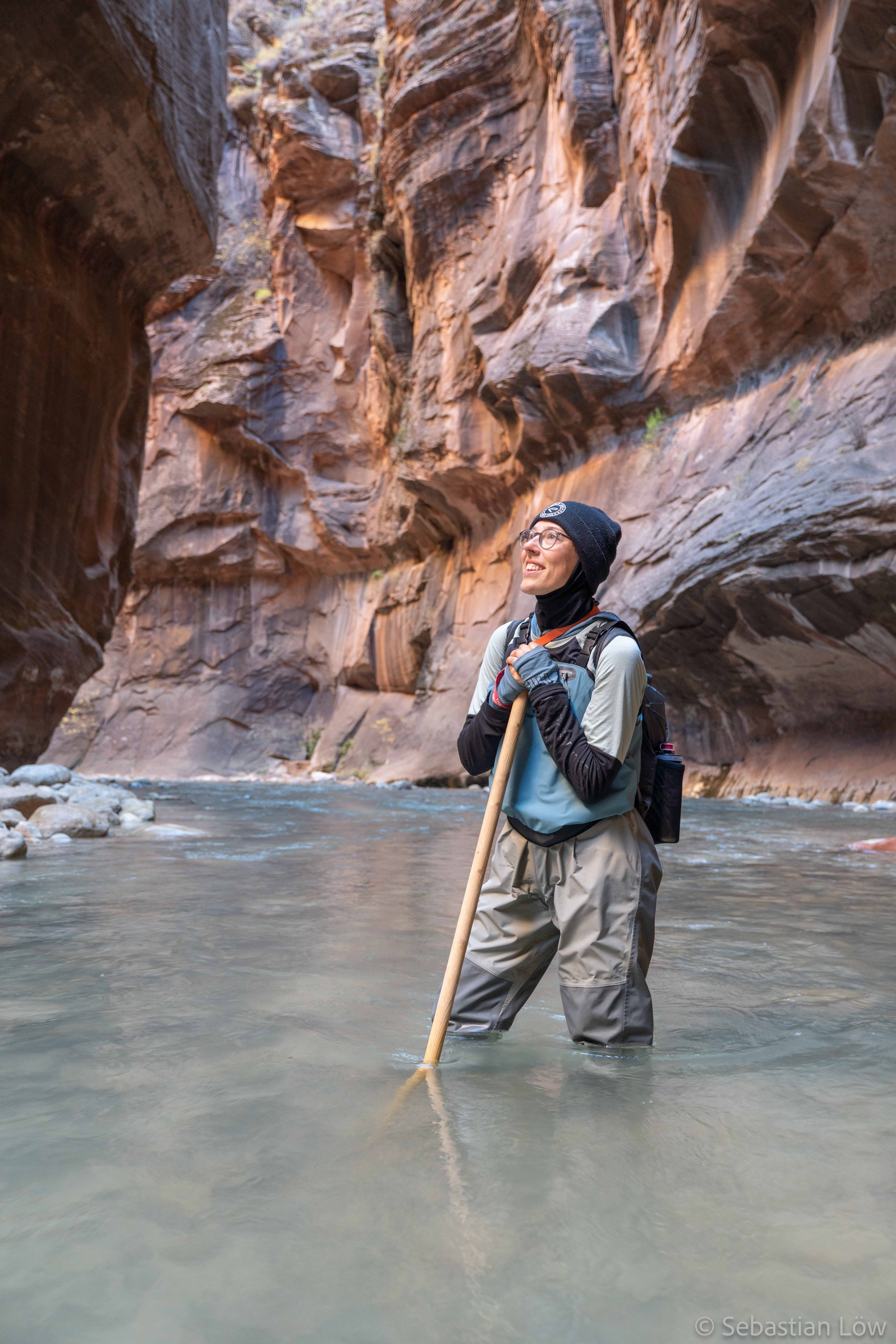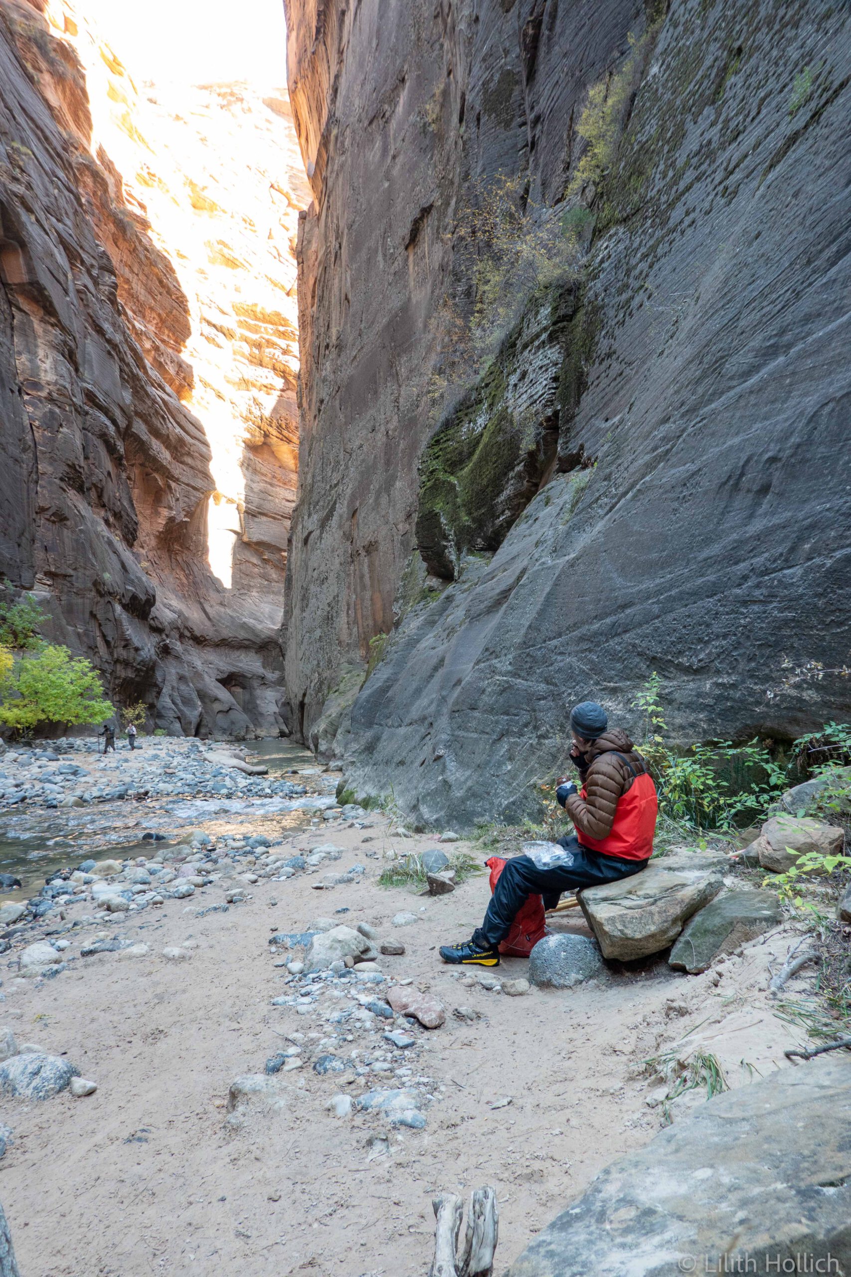 As the water was already quite cold when we were there, we decided to rent neoprene socks, water shoes and dry bibs. Unfortunately, we had to change from our camp spot to another one that day. We needed to leave so early in the morning that the other one wasn’t vacant yet and had to pack up everything as normal. We rented a locker for our bags and valuables, locked the bikes at the campsite and took the shuttle bus to the trail head. Fully equipped with our water shoes, dry bibs and long wooden stick, we entered the canyon. The water was everything from ankle deep to belly deep, sometimes it was possible to walk on sand next to the river. We hiked into the canyon for several hours, before we turned around to make it back in time. The canyon walls were so high! The water pressed against the legs, but with the dry bibs, everything stayed dry which felt a little bit like magic. We took lots of pictures and to this day I am still impressed that none of us had dropped any electronics into the water. A few crazy people hiked without dry bibs or neoprene gear, only with sandals or crocs.. Sebi and I got cold feet just watching it! After seven hours, we were back at the trail head, tired and happy. We returned the rental gear and spent the rest of the evening with Kris and his friend at their campsite.