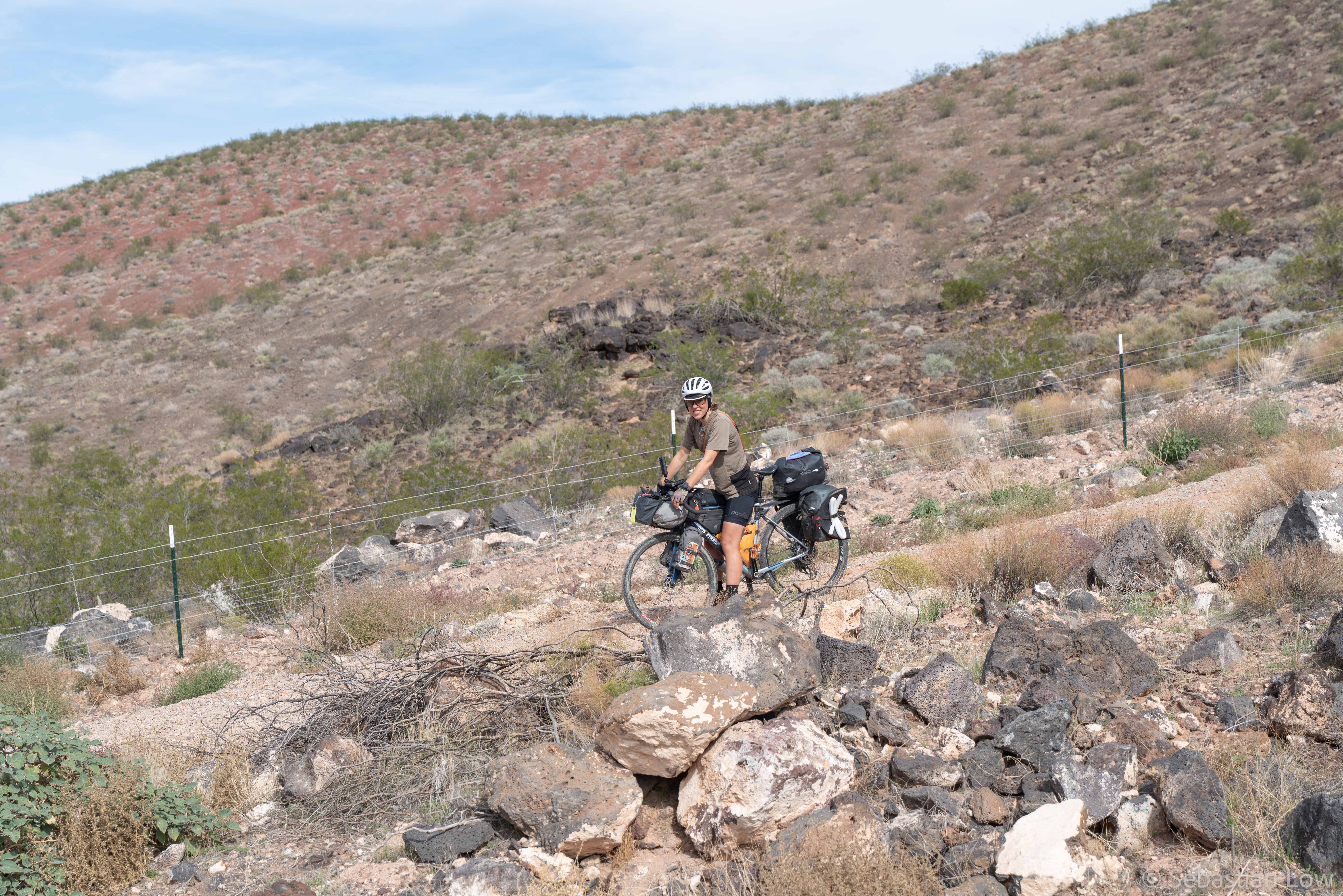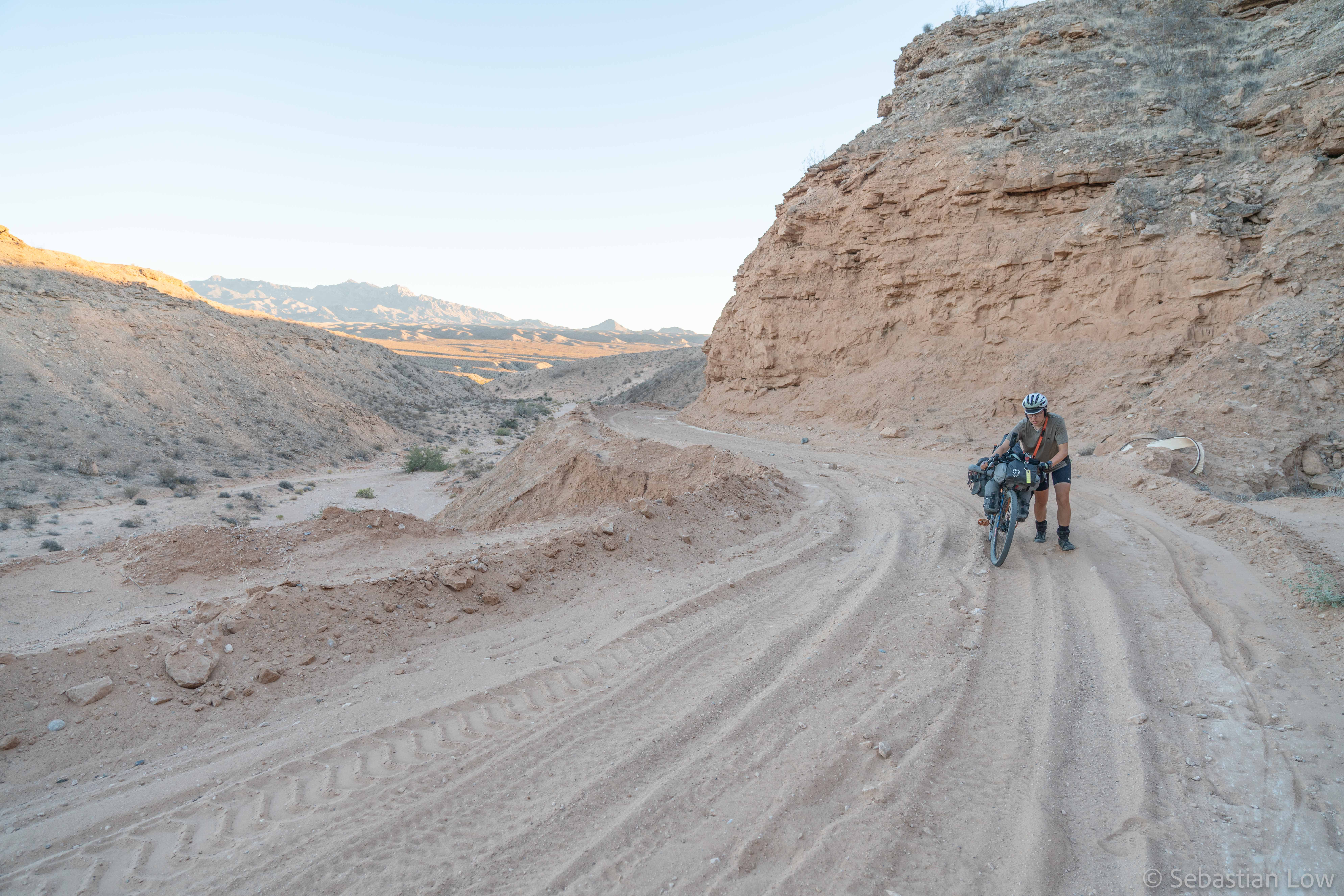 Three more days of cycling and we would be in Las Vegas. I really wanted to see the city, although I would never fly there to go there. Now it was basically on our way! We said good-bye to our lovely hosts and had a beautiful day of riding – uphill, downhill, Joshua trees – until we turned onto a dirt track in the afternoon. Road options were limited and that dirt track was the only alternative to the super busy, dangerous and maybe even prohibited Interstate highway. Unfortunately though, the track was incredibly sandy and we pushed at least 90% of the first 15 km. It got dark, it was a lot of uphill and we had no idea when the track would get better. We kept pushing until we reached the top of a plateau and felt like we had gotten through the worst part. It was well after 10 p.m. when we finally pitched our tent somewhere next to the track.