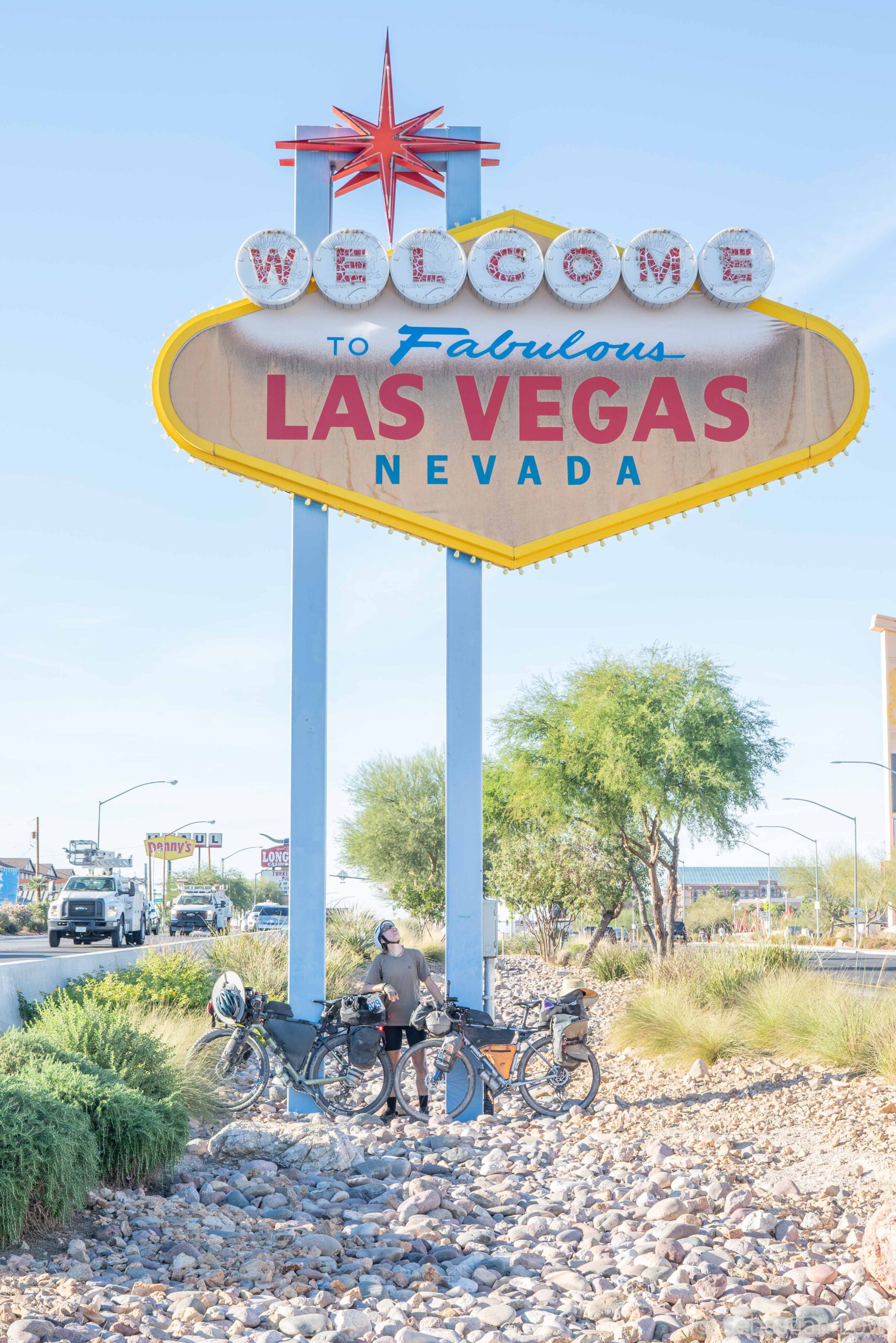Thankfully, the next day the track got better faster than expected and we were back on smooth-rolling gravel and pavement. We saw more and more different cacti and found lots of stuff next to the road, a broken iPod classic and cassettes among other things. One last night of wild camping outside of Las Vegas, before we cycled into the city of superlatives. The weather was incredible and we waited until we found a place in the shade until we stopped for lunch. Las Vegas had way more cycling lanes than expected, but at the same time a lot of road works and the dreaded city cycling was nearly as exhausting as feared. At some point, a car slows down when approaching us and the driver waved enthusiastically at us. It took us a moment to recognize the person – it was Tristan, in a rental car! The Canadian cyclist we had last seen when we were all hiding from the thunderstorms at a visitor center. So funny. Obviously amused to be on the other side of things for the day, he asked us if we needed some water or snacks.